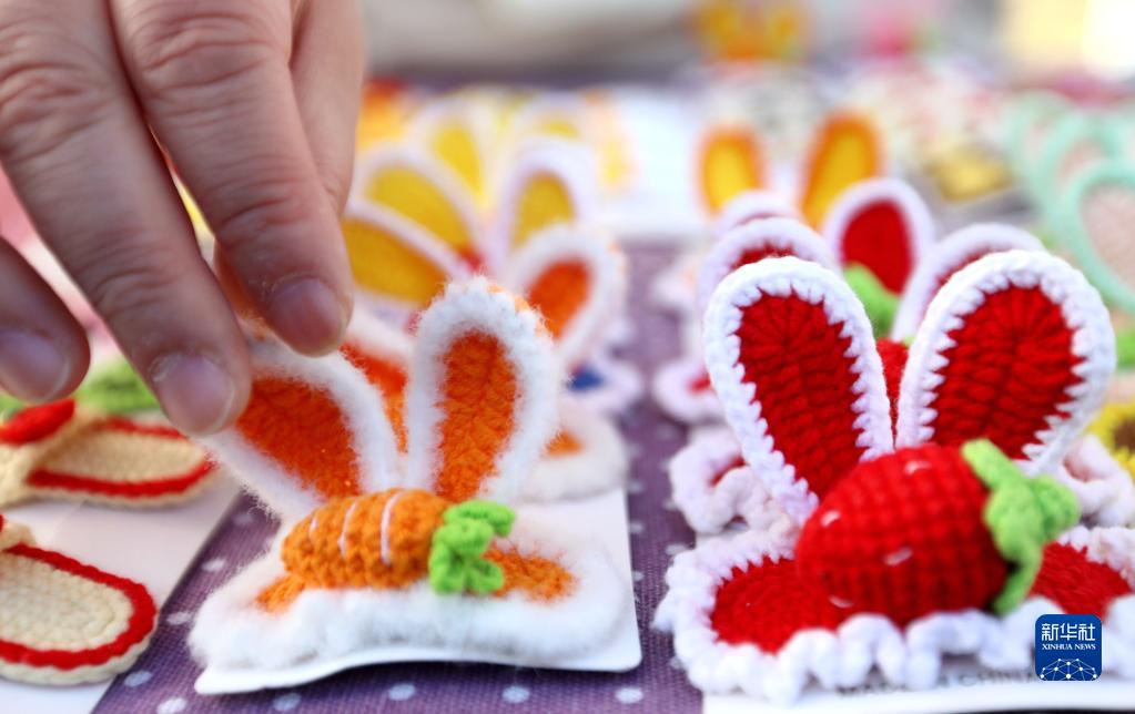 1月15日,一名市民在河北省沧州市的年集上挑选兔子耳朵形状的发卡。