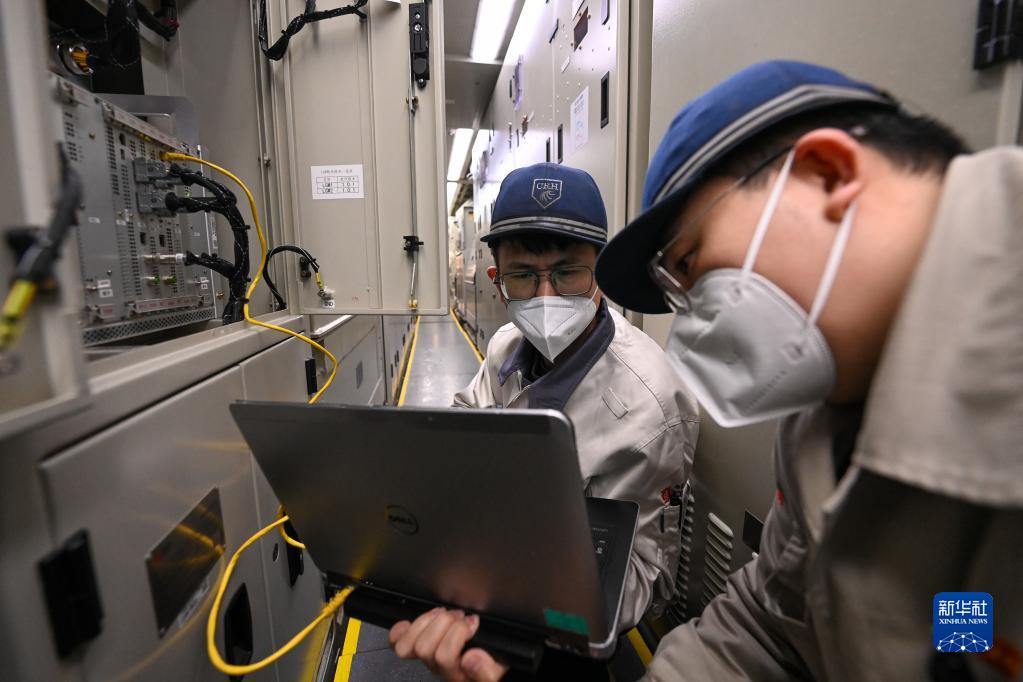 1月14日晚,在乌鲁木齐车辆段动车组运用所,机械师在动力车进行动车组运行数据分析。