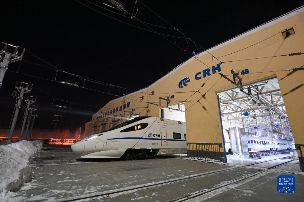 1月14日晚,完成检修的动车组驶出乌鲁木齐车辆段动车组运用所检修库。