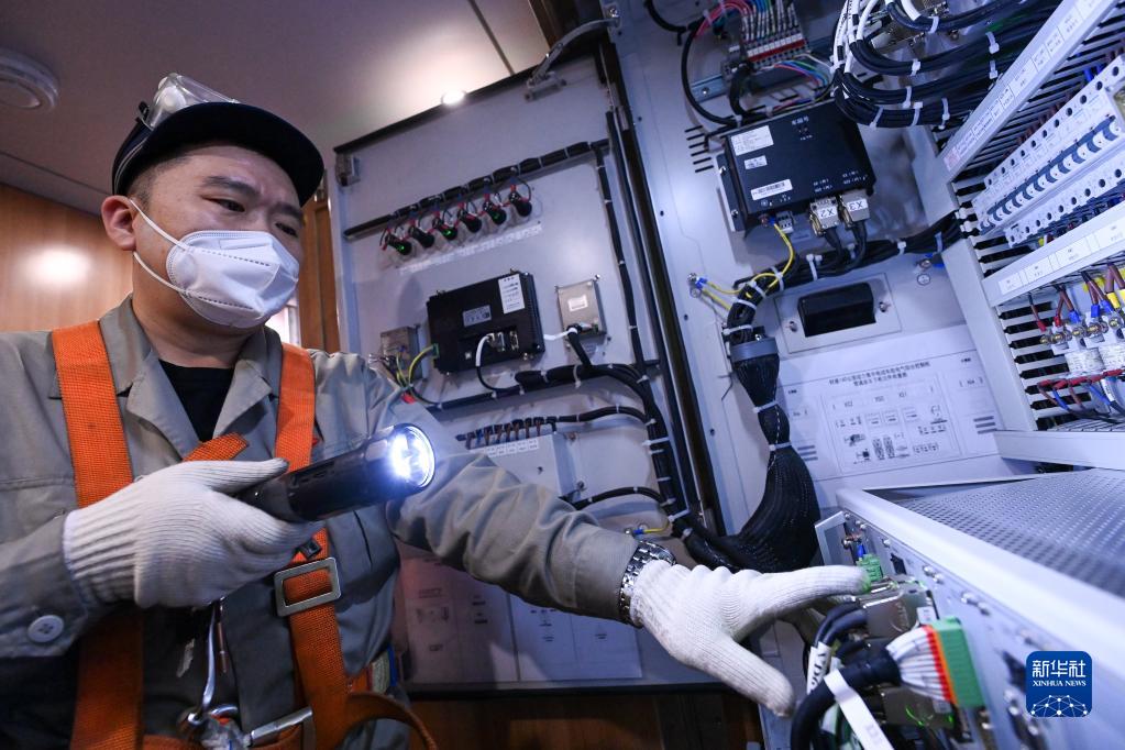 1月14日晚,在乌鲁木齐车辆段动车组运用所,机械师在检查电气综合控制柜。