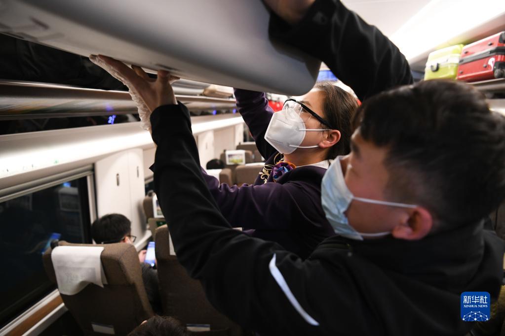 1月14日凌晨,在上海虹桥开往亳州南的G9480次高铁列车上,中国铁路上海局集团有限公司合肥客运段列车员王昊(后)帮助旅客摆放行李。