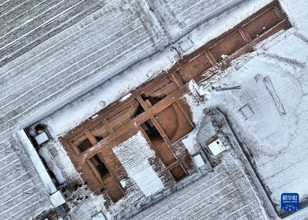 这是河南汉魏洛阳城宫城遗址的宫城东墙发掘区全景(1月14日摄,无人机照片)。