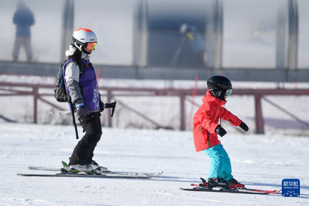 1月15日,一位小朋友(右)在教练的指导下学习滑雪。