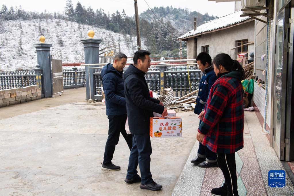 1月15日,在汉寿县丰家铺镇笔架村,乡村振兴驻村工作队成员给脱贫户拜年。