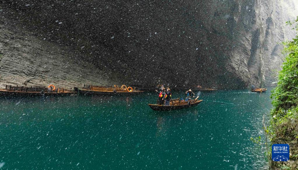 1月15日,游人在湖北省鹤峰县屏山峡谷赏雪。
