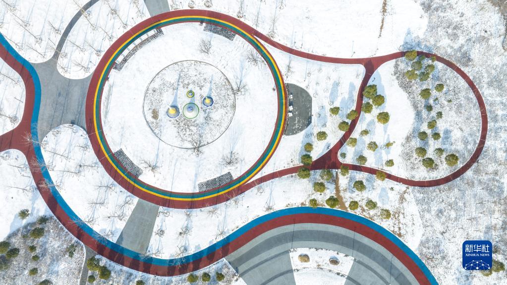 这是1月15日拍摄的湖北省襄阳市鱼梁洲环岛景观带雪景(无人机照片)。