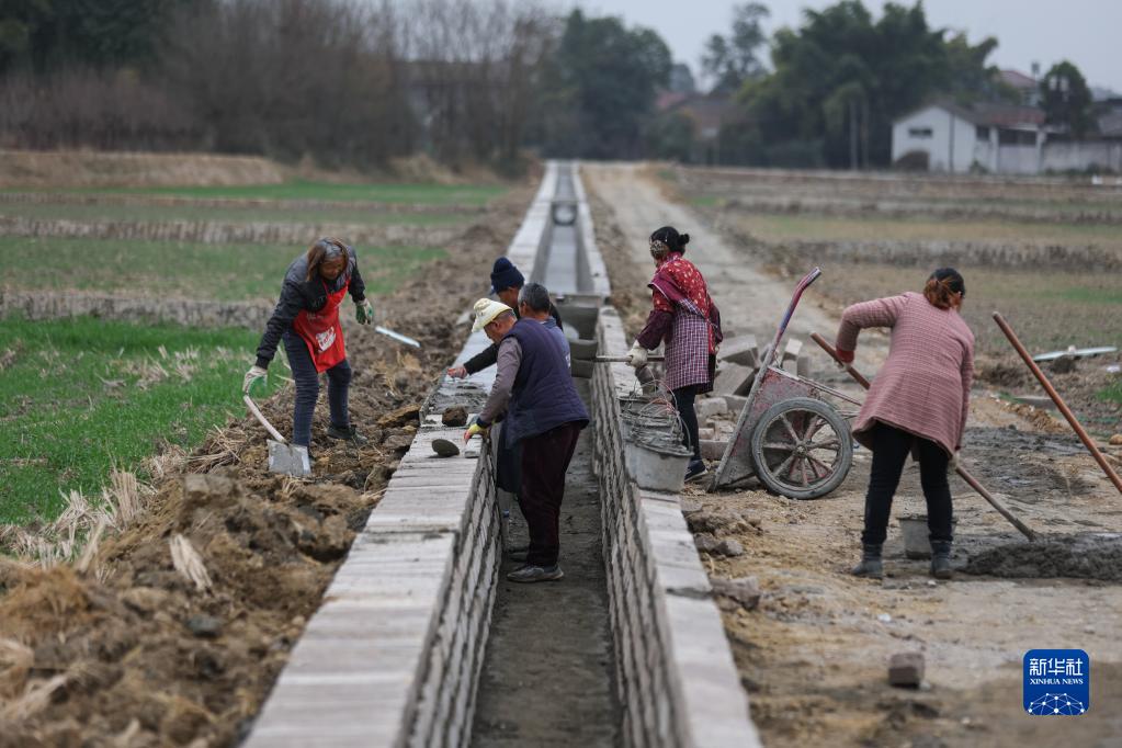 1月14日,在绵竹市新市镇石虎村,村民参与排灌渠整理工作。