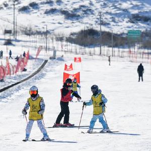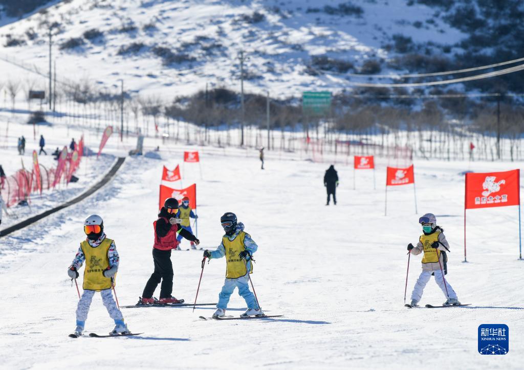 在新疆白云国际滑雪场上,小朋友们跟随教练学习滑雪技能(1月13日摄)。