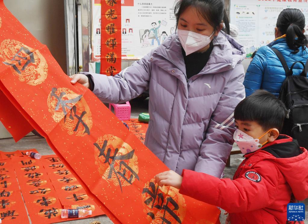 1月16日,在广西南宁市西乡塘区新阳街道永和村,村民在欣赏刚刚完成书写的春联。