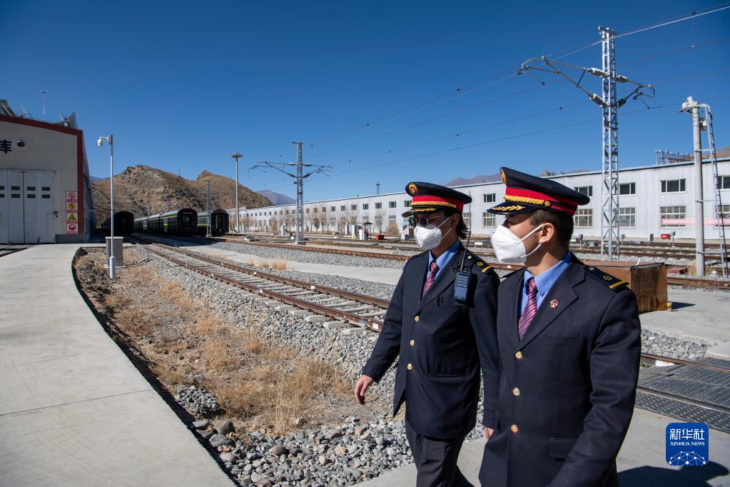 在拉萨机辆整备中心,黄起岗(右)和同事前往动车组检修库(1月11日摄)。