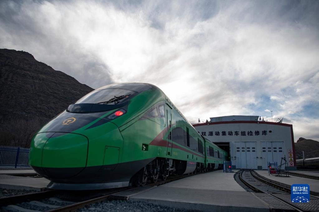 在拉萨机辆整备中心,动车组在检修库进行整备作业(1月10日摄)。