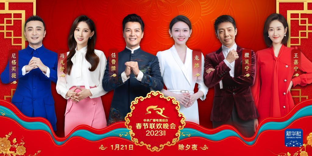 2023年春晚主持人阵容公布:任鲁豫、撒贝宁、尼格买提、龙洋、马凡舒、王嘉宁。这是宣传海报。