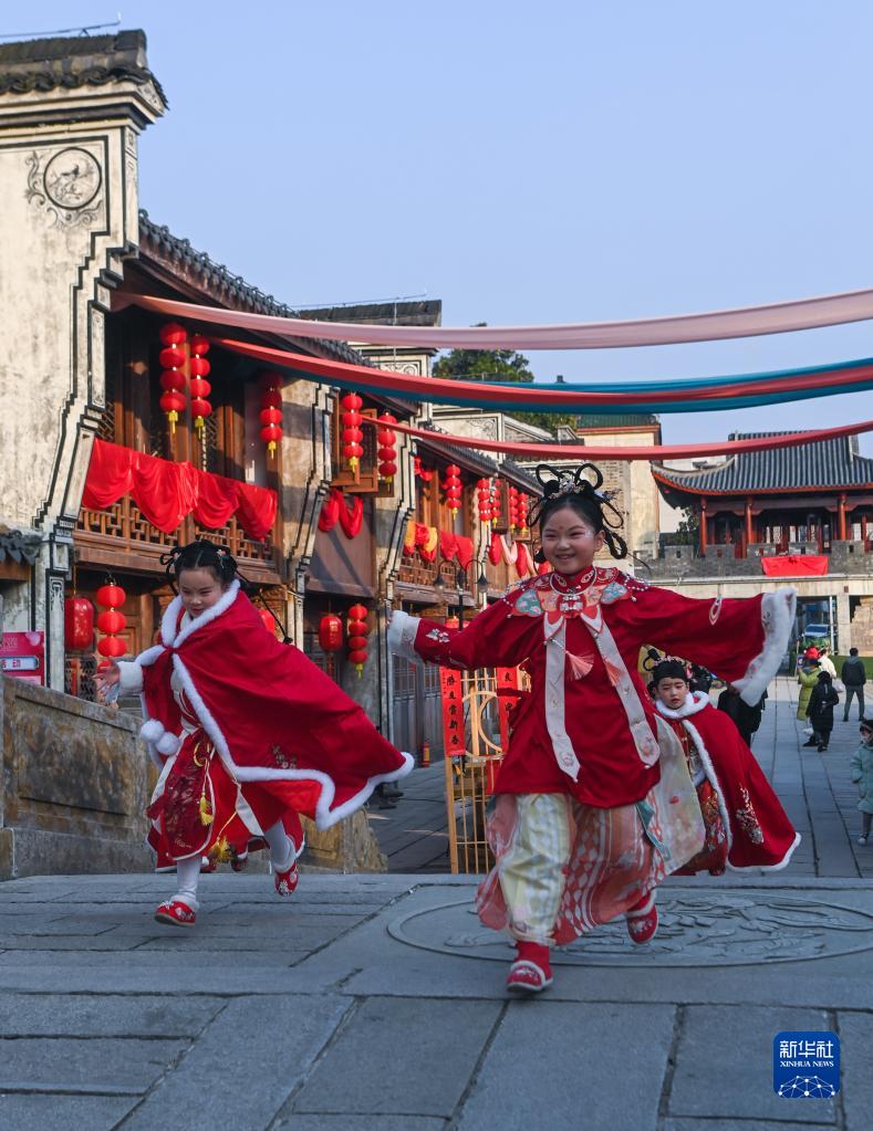 1月16日,身着传统服饰的孩子在新登镇宋韵文化特色街区嬉戏。
