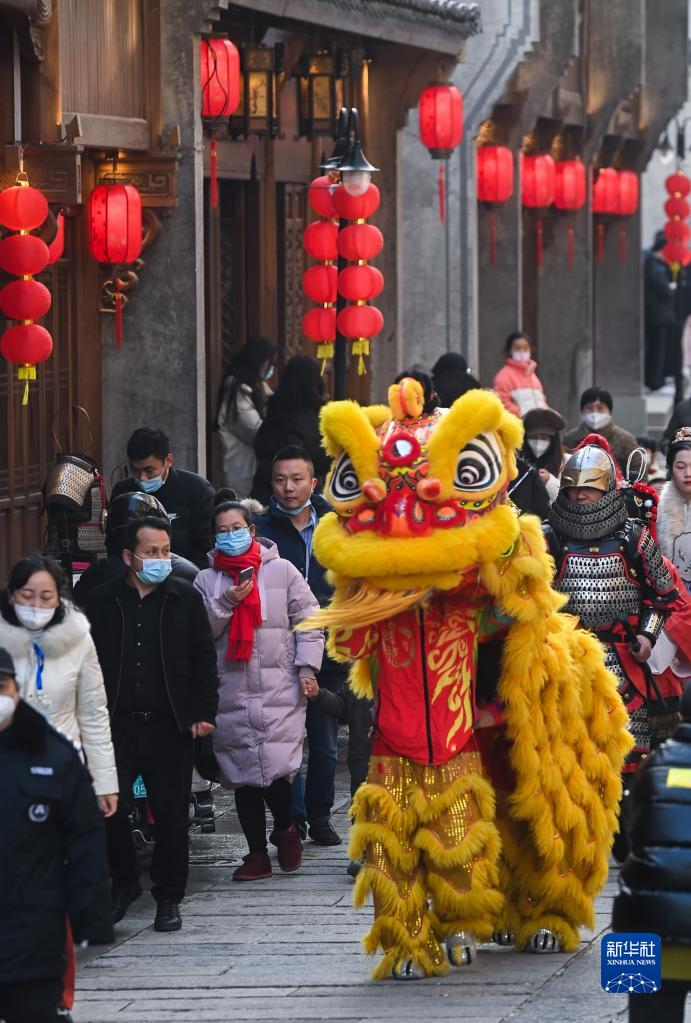 新登镇宋韵文化特色街区的传统舞狮巡游(1月16日摄)。