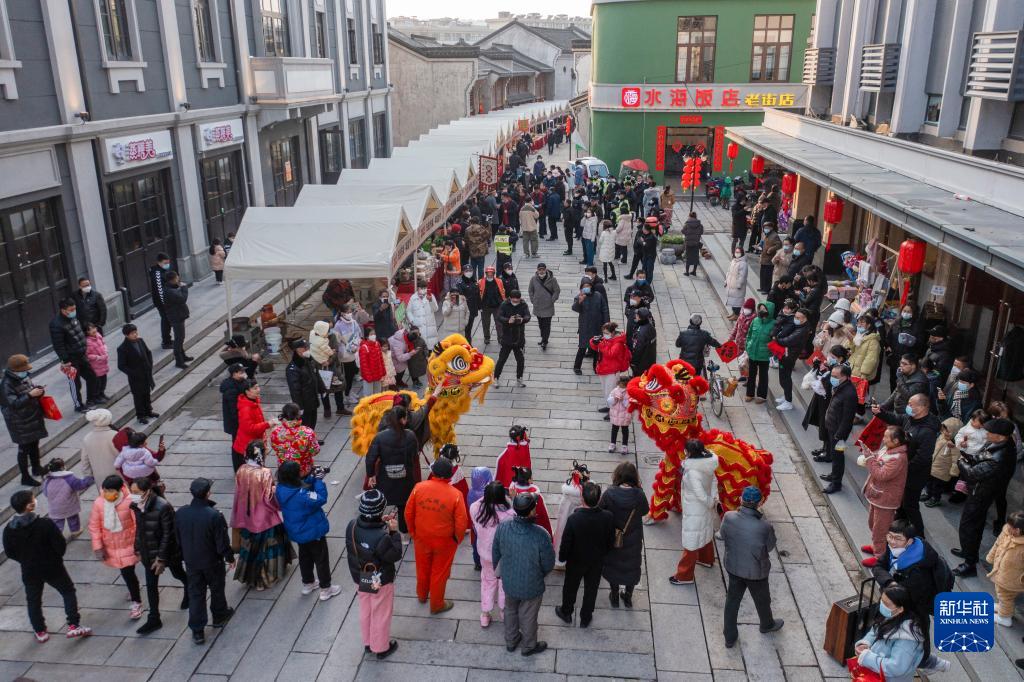 新登镇宋韵文化特色街区的舞狮表演(无人机照片,1月16日摄)。