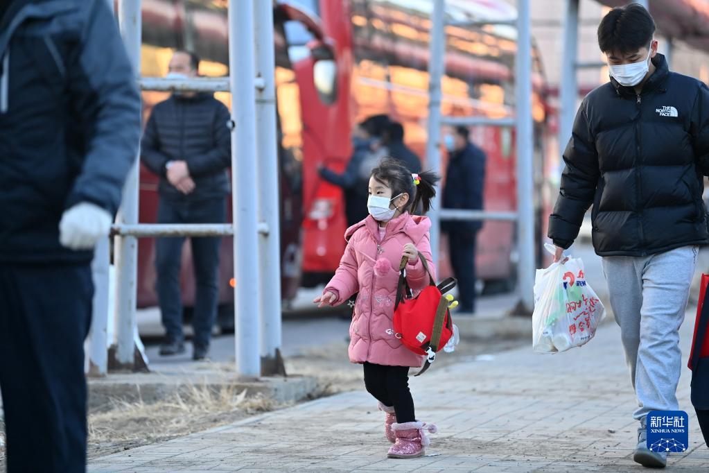 1月16日,返乡工人带着小孩在天津市北辰区宜兴埠镇准备登车返乡。