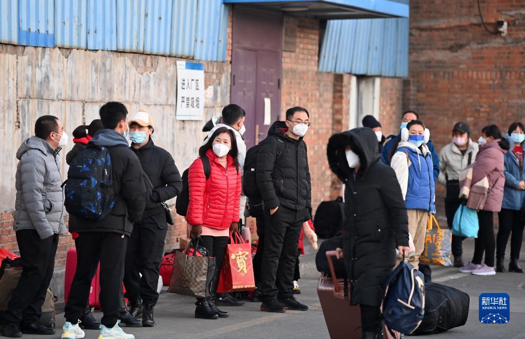 1月16日,返乡工人在天津市北辰区宜兴埠镇等待车辆到达。