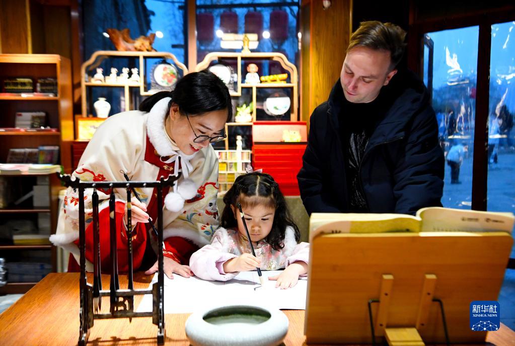 1月13日,在洛阳市洛邑古城一家文创店内,乔丹与妻子范梦佳教女儿艾润写毛笔字。