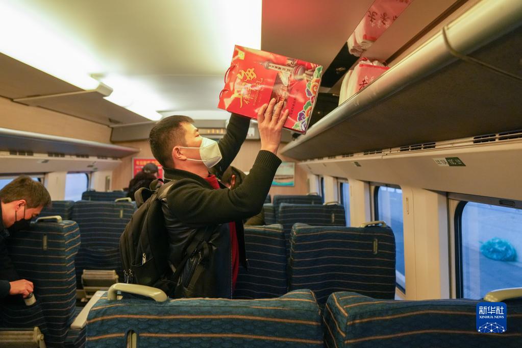 1月15日,在上海南站,易生军将行李放置在列车行李架上。