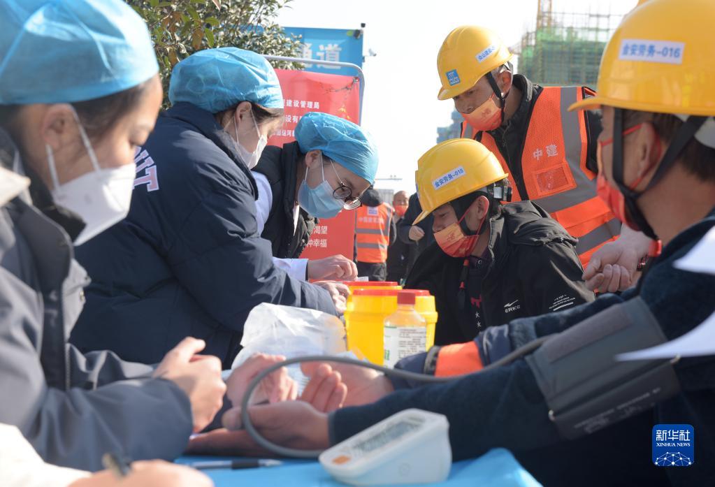 1月16日,医护人员为即将返乡的中建四局六公司的工人进行健康体检。