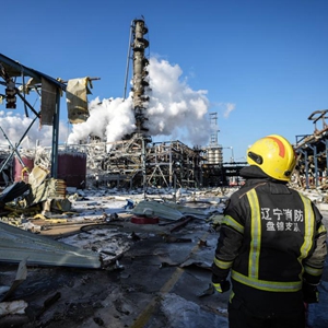 1月16日,消防员在辽宁盘锦爆炸事故现场开展搜救工作。