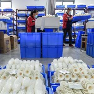 在锦屏经济开发区贵州亚狮龙体育文化产业发展有限公司羽毛球生产基地,工人搬运羽毛球(2022年12月19日摄)。