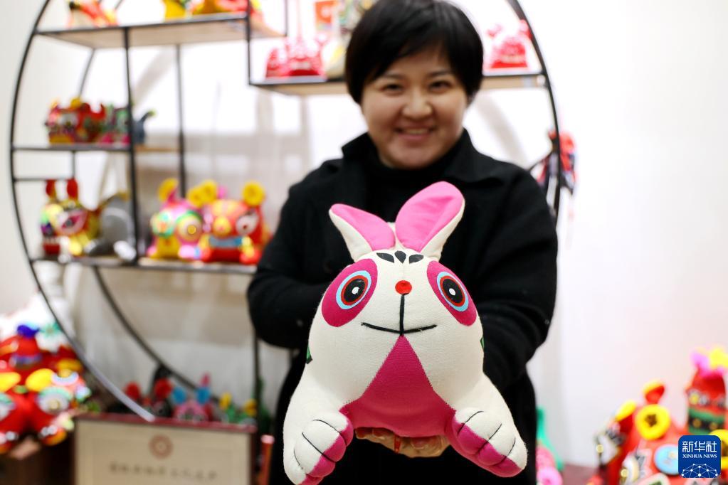 1月16日,手工艺人在山东省滨州市滨城区彭李街道的一家手工艺坊展示布艺兔。