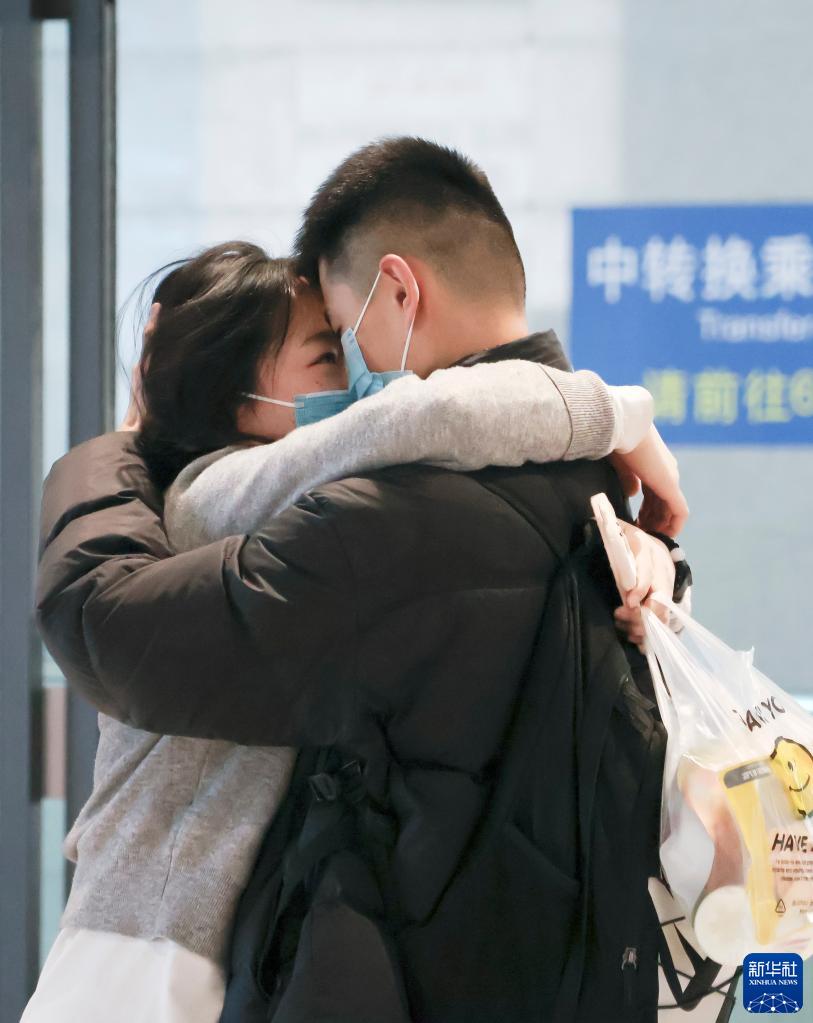 1月13日,在贵阳北站出站口,白先生接到从深圳前来的女友后相互拥抱。新华社记者 刘续 摄