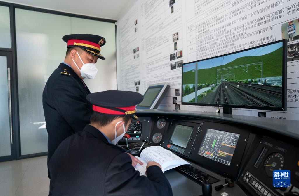 1月15日,丁建华(左)在火车模拟驾驶设备前为徒弟姜庭瑞进行讲解。