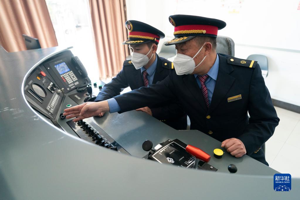 1月15日,丁建华(右)在火车模拟驾驶设备前为徒弟姜庭瑞进行讲解。