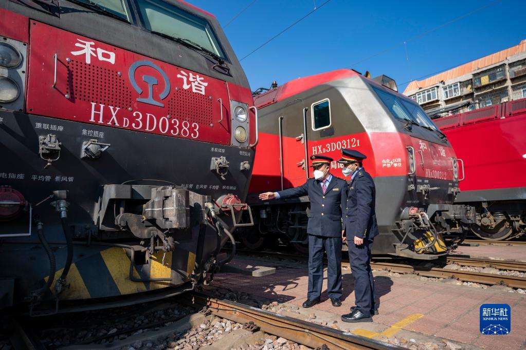 1月15日,丁建华(左)给徒弟姜庭瑞介绍火车头相关知识。