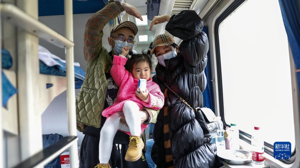 1月16日,在开往册亨的绿皮火车卧铺车厢,返乡的一家三口在车上合影。