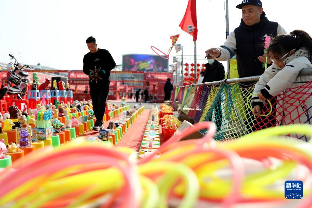 1月17日,市民带着孩子在山东省青岛西海岸新区一处集市玩套圈。