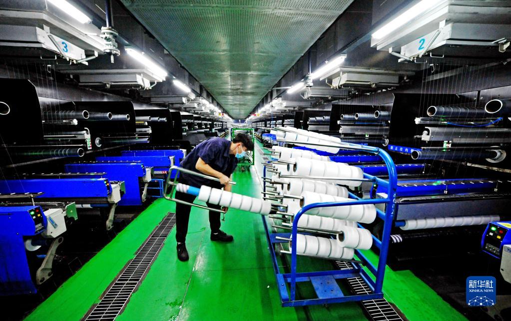 1月17日,在江苏省连云港市一家氨纶公司,工人在车间生产线上忙碌。