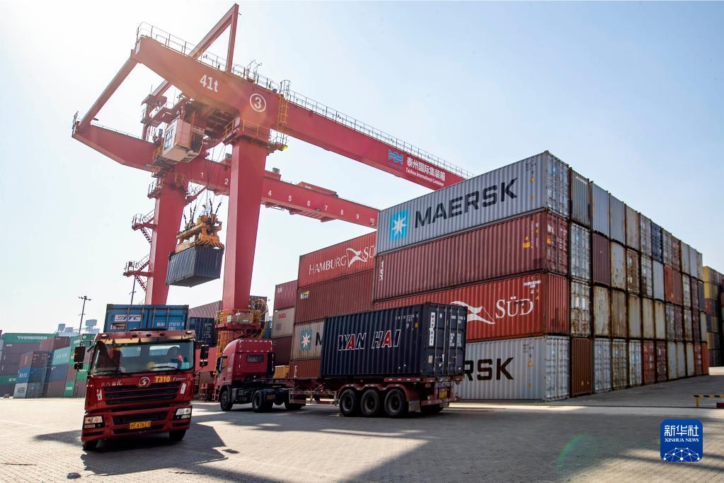1月17日,运输车辆在江苏泰州港国际集装箱堆场转运集装箱。