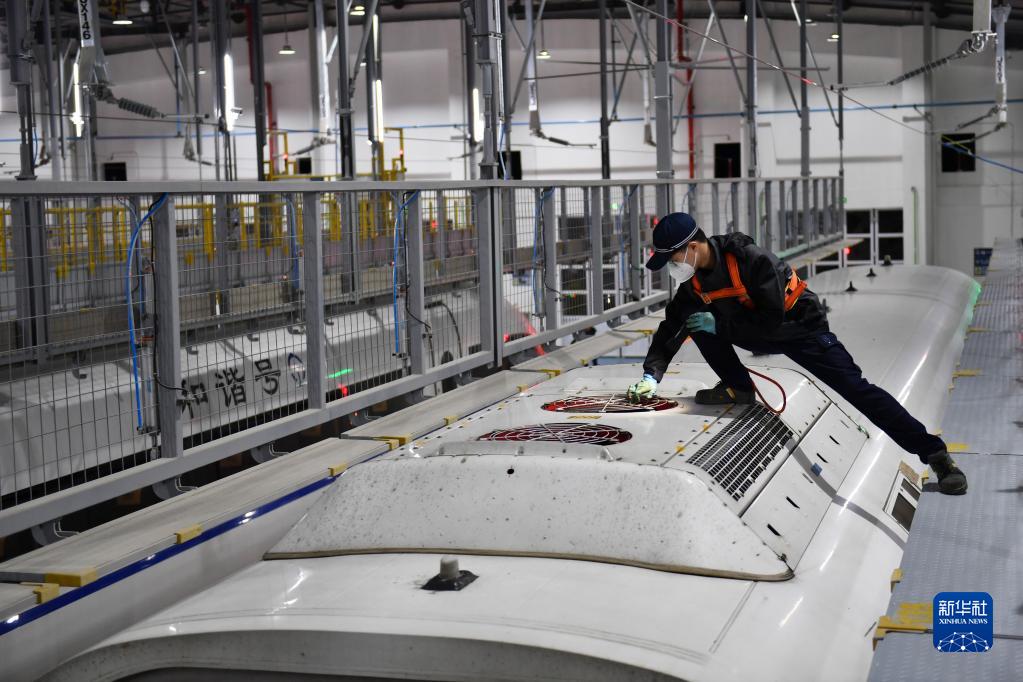 1月16日,检修员在长沙西动车运用所进行检修作业。
