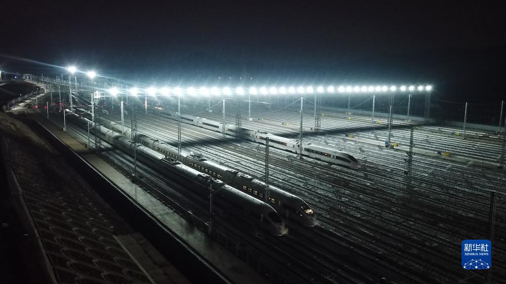 1月17日,列车准备进入长沙西动车运用所(无人机照片)。