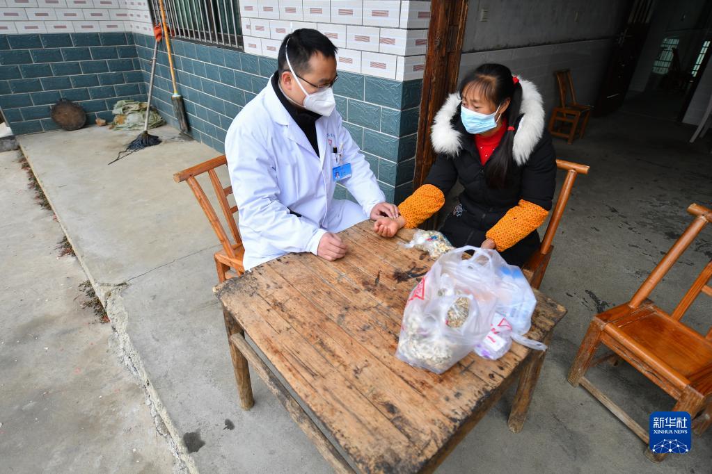 1月17日,在长沙市望城区乔口镇盘龙岭村,医护人员为有不适症状的村民把脉。