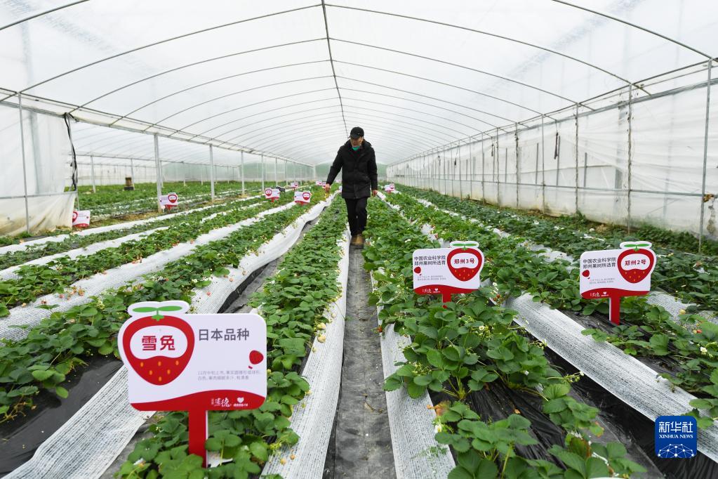 1月17日,浙江省建德市杨村桥镇草莓种植大户吴东良在大棚内查看引进的新品种草莓苗。