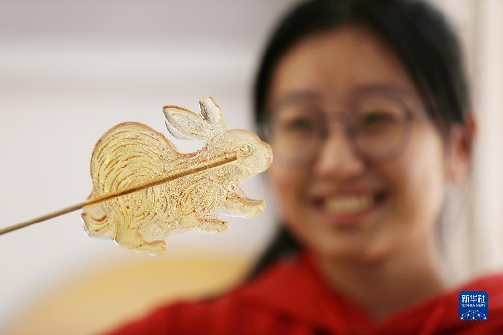 1月17日,在山东省临沂市郯城县郯城街道东城社区妇女儿童活动中心,一个女孩展示兔子糖画。