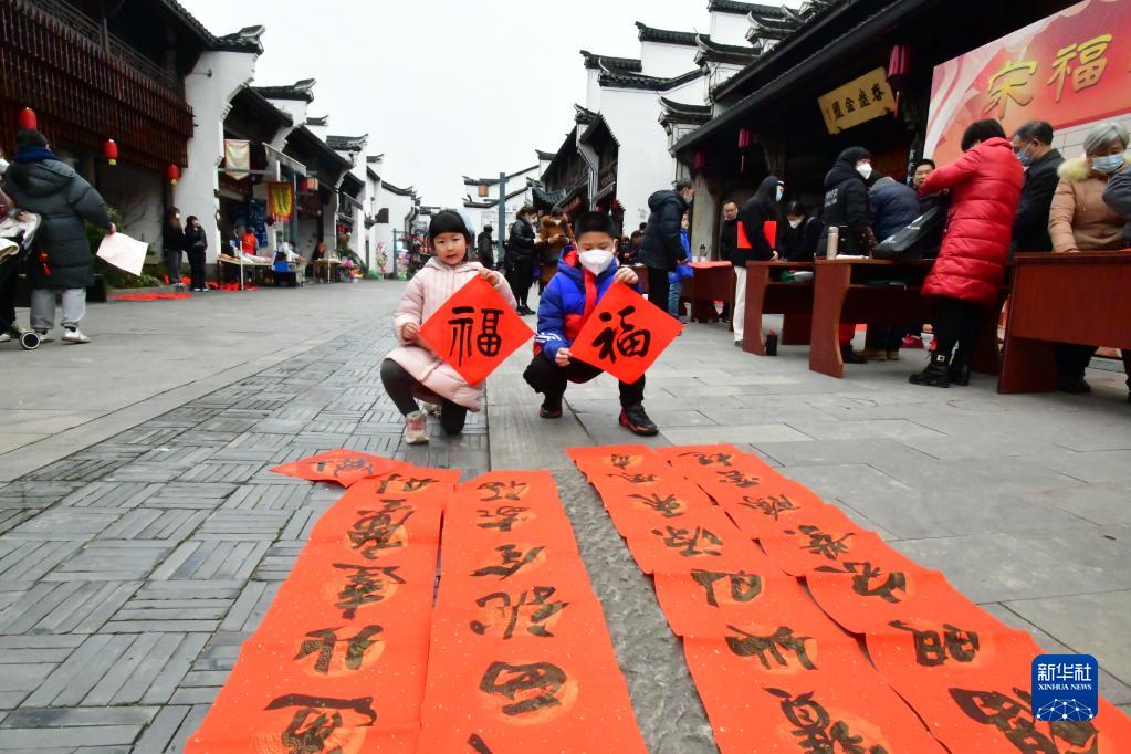 1月17日,在浙江省建德市梅城镇南门街,孩子们展示“福”字和春联。