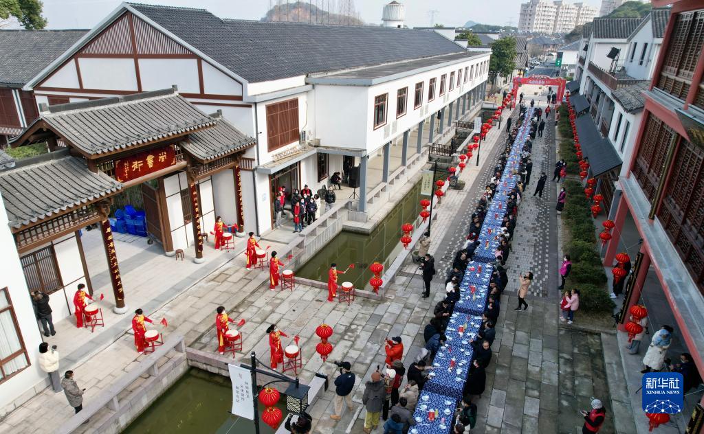 1月17日,在浙江省湖州市德清县洛舍镇东衡村长桌宴活动现场,村民与游客共品当地特色佳肴(无人机照片)。