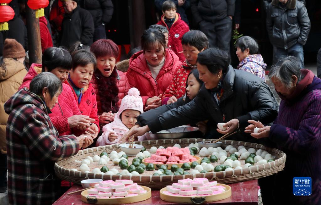 1月17日,浙江省湖州市德清县舞阳街道山民村村民在做圆子、制礼糕。