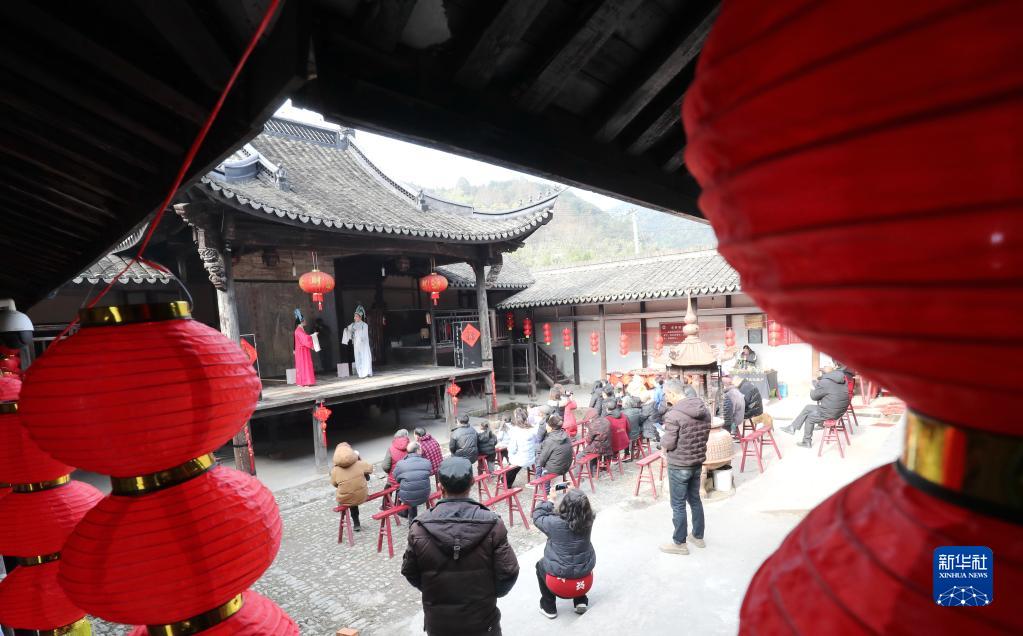 1月17日,浙江省湖州市德清县舞阳街道山民村村民在观看戏曲节目。