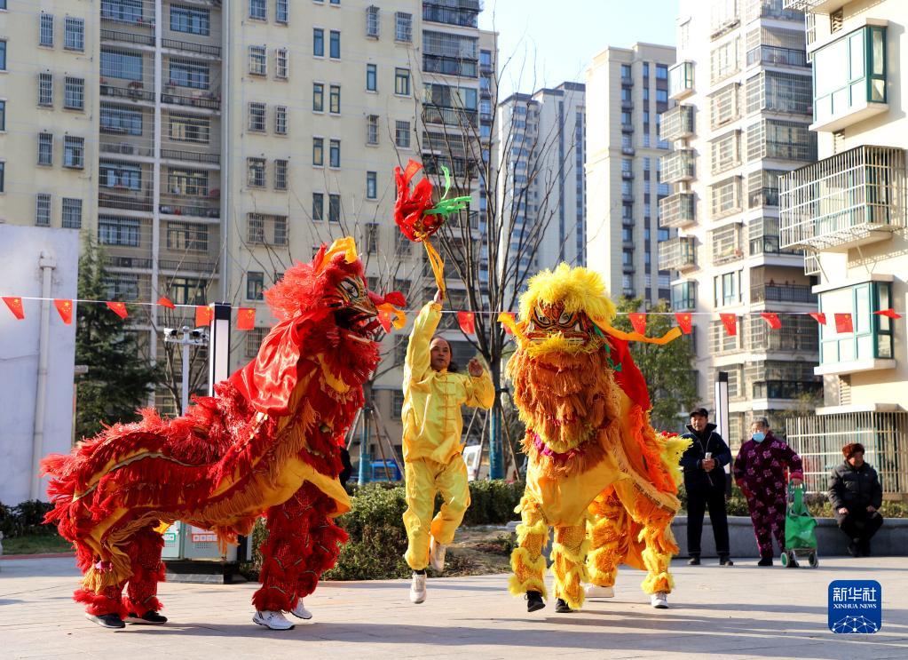 1月17日,在安徽省肥西县上派镇灯塔社区,民间艺人为居民表演舞狮。