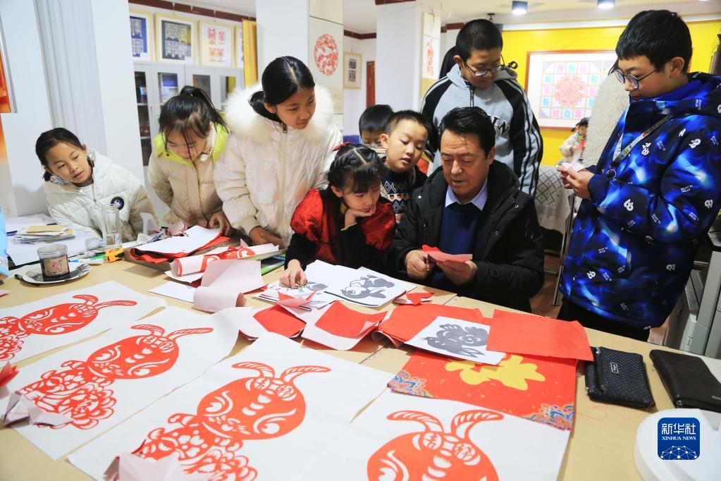 1月17日,在甘肃省定西市安定区文化馆,剪纸传承人教授学生创作生肖兔剪纸作品。