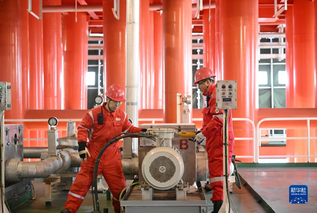 埕海一号海上采油平台机械工人在对闭排泵进行维护作业(1月16日摄)。