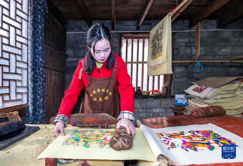 春节临近,湖南省邵阳市隆回县滩头镇的木版年画作坊加班加点赶制年画,供应春节市场。