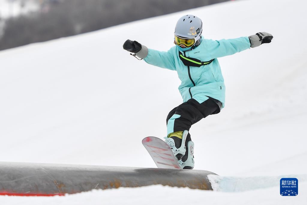 都轩铭在吉林省吉林市万科松花湖度假区V-PARK地形公园挑战场地道具(2023年1月14日摄)。