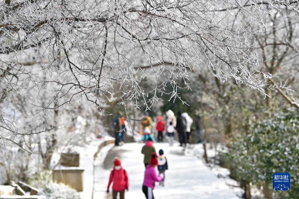 1月15日,游人在南京紫金山观赏雪景。